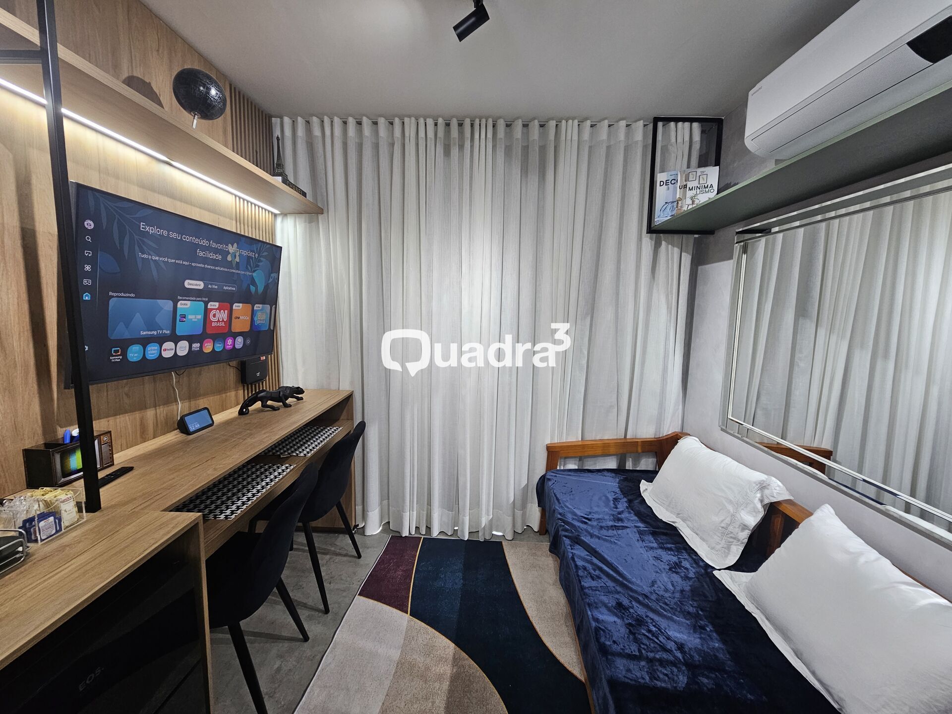 Quarto com rack de tv, cortina, ar-condicionado, armario.