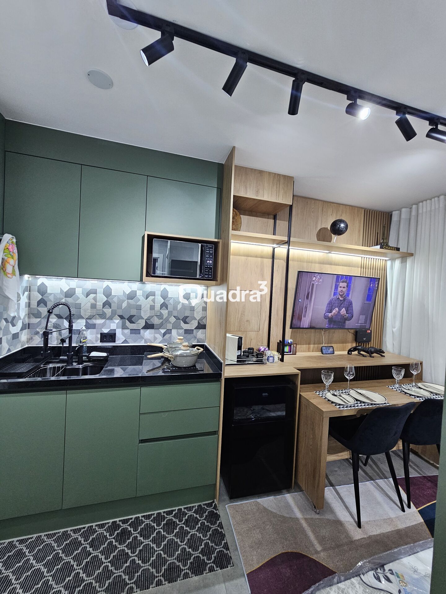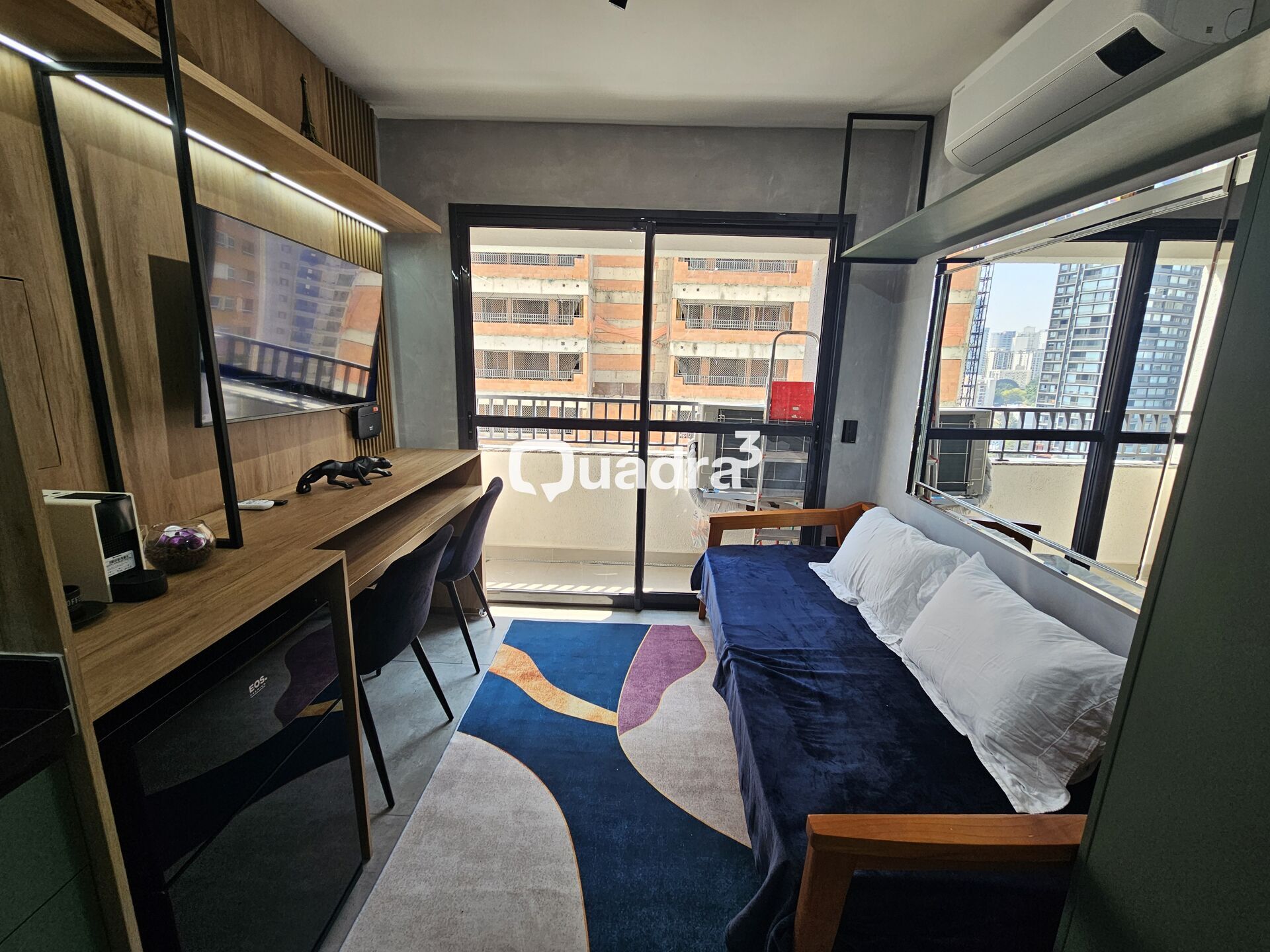Sala com Rack embutido, cortina Black-out, ar condicionado.
