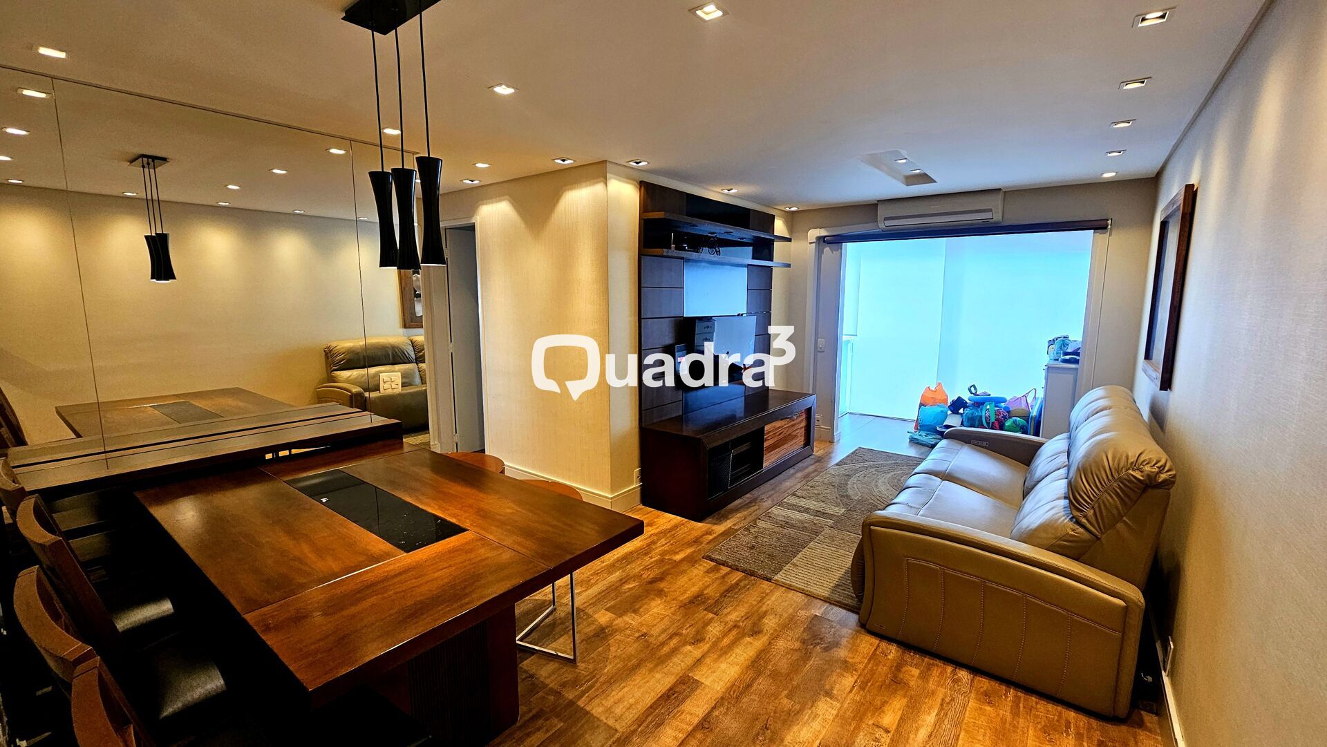 Living para 2 ambientes sendo jantar e tv com piso madeira com uma excelente varanda integrada, trazendo amplitude.